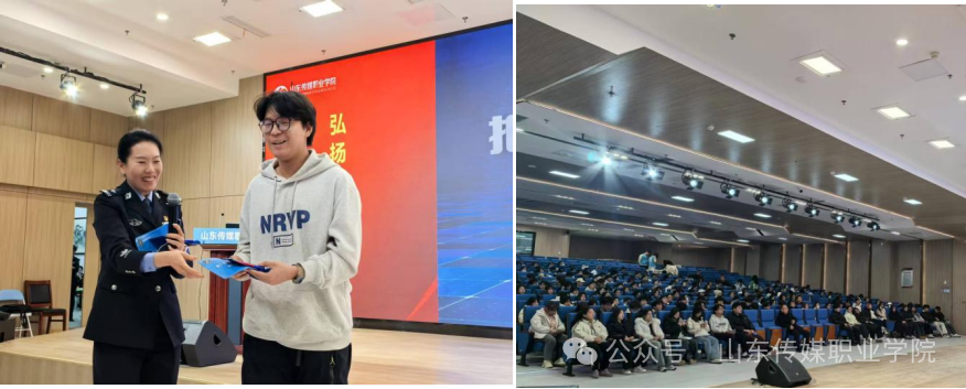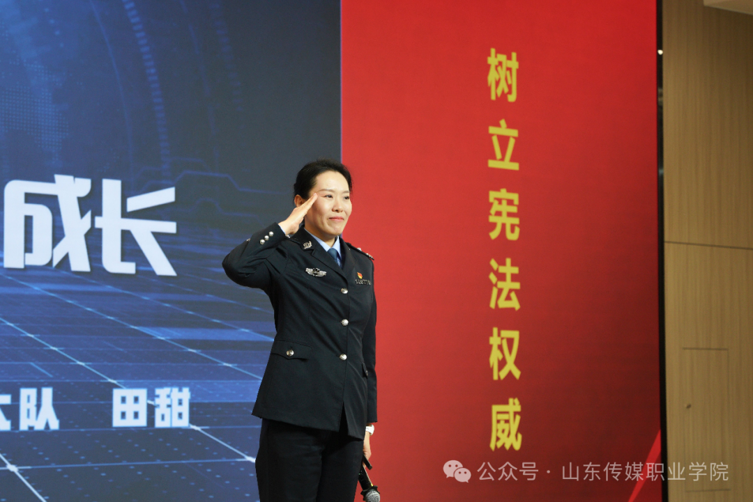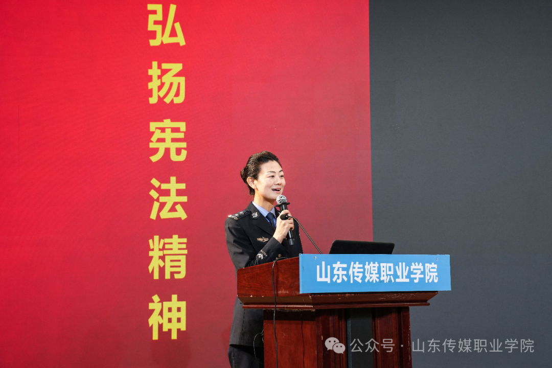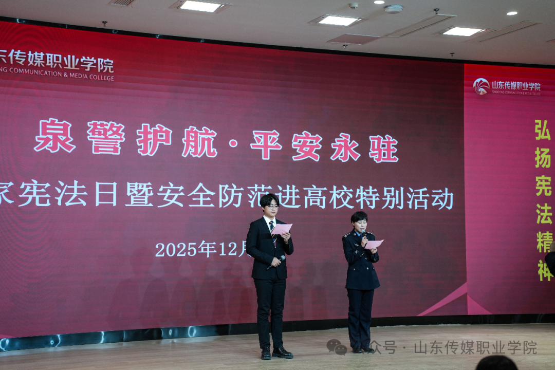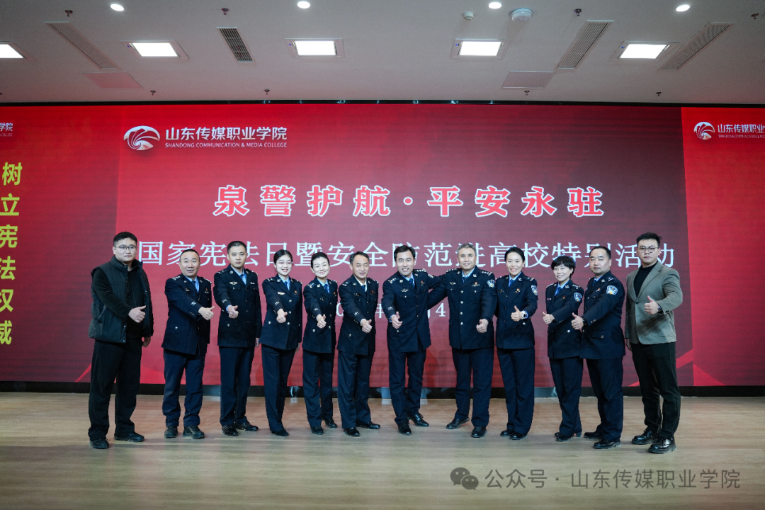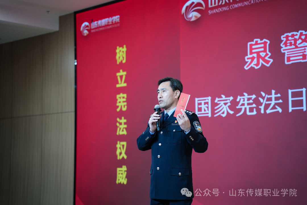 12月4日下午,在第十二个“国家宪法日”到来之际,由济南市公安局、济南市国家安全局、济南市司法局联合主办的“泉警护航・平安永驻”国家宪法日暨安全防范特别活动走进山东传媒职业学院,在章丘校区产教融合中心报告厅成功举行。学院党委委员、工会主席尹纪瑜出席活动,400余名师生代表共同参加。