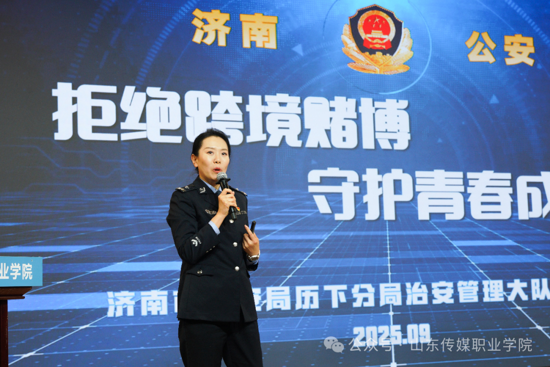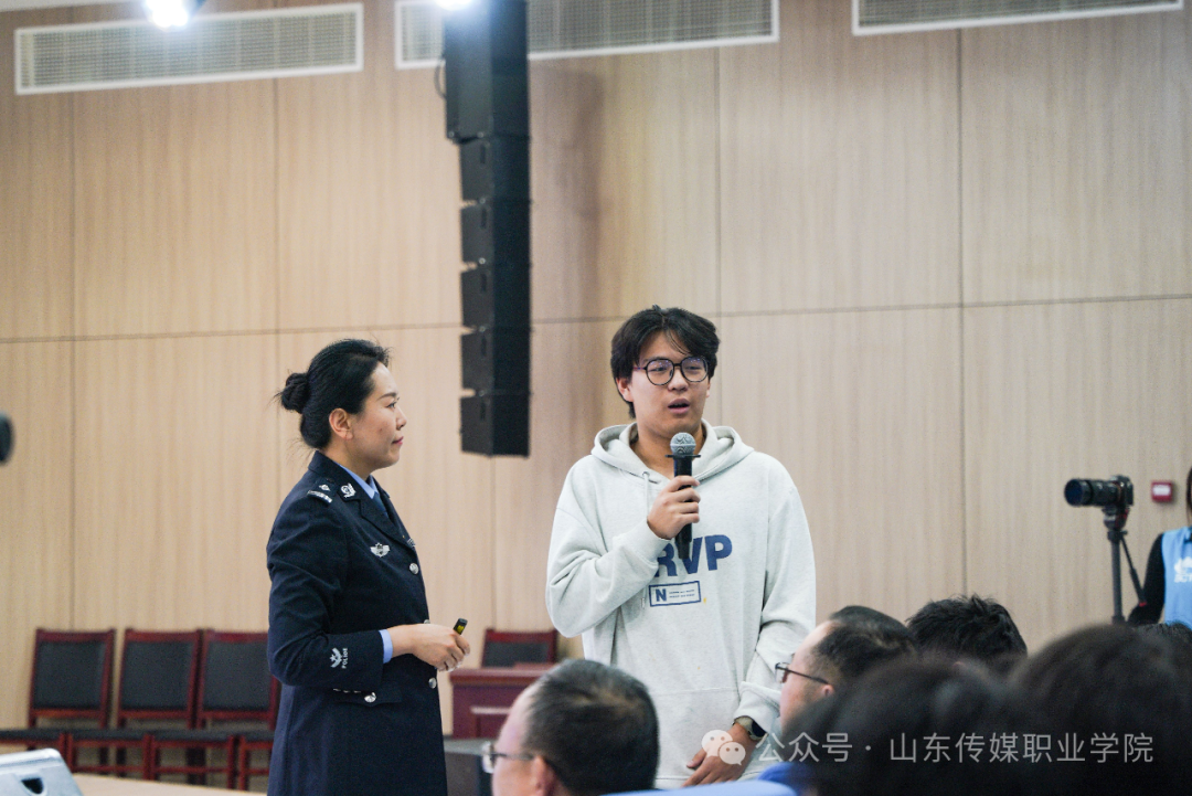本次活动紧扣宪法宣传,防范电信诈骗、远离跨境赌博、安全规范上网、树立总体国家安全观等关键主题,以“专题授课+普法脱口秀”的创新模式展开宣传教育。来自章丘分局反诈中心的民警以《防范电信网络诈骗,守护幸福生活》为题,用真实案例剖析诈骗手法,提升学生识骗防骗能力;市司法局特邀律师带来的《就这么简单》普法脱口秀,轻松幽默的脱口秀形式普及法律常识;历下分局民警围绕赌博危害与网络安全开展警示教育,通过互动问答强化学生远离赌博、守法上网的意识;市国家安全局干警从国家、校园、个人三层面引导学生筑牢国家安全观念。