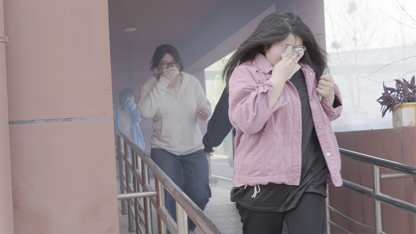 消防演练现场,烟雾弹点燃、警报声同步响起,火灾逃生演练正式开始。学生在指引下,严格按照消防逃生规范,弯腰低姿、用湿毛巾捂住口鼻,沿楼层两侧楼梯有序撤离。各楼层引导员在楼梯口、拐角处定点值守、全程疏导,确保撤离过程快速、安全、有序。全体师生顺利抵达食堂东门指定集结点后,各班立即清点本班学生人数,整个逃生环节紧张高效。